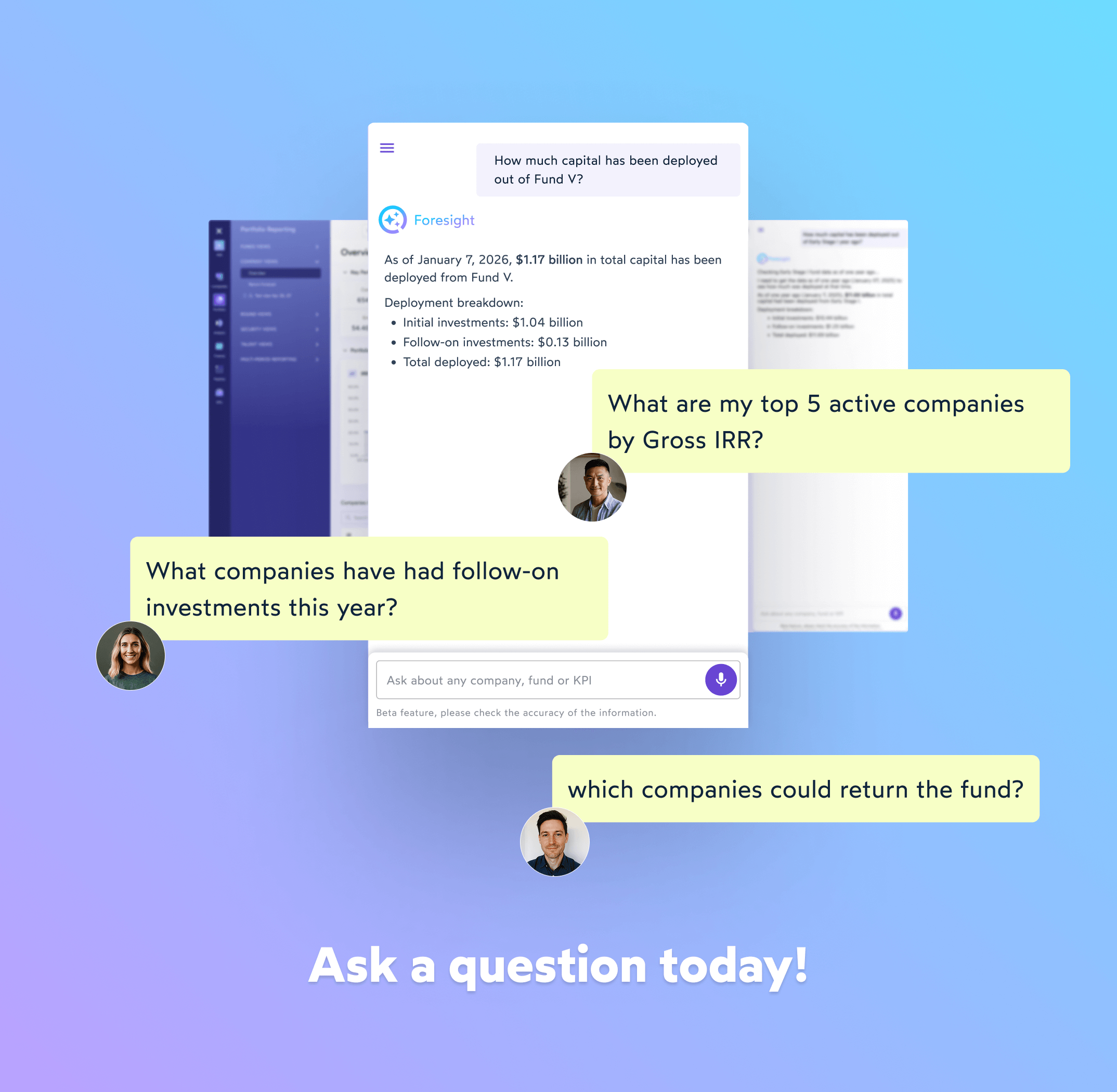 Foresight Portfolio now has a natural language chat interface integrated into our desktop as well as an interface optimized for mobile, which means you can ask questions – with your fingertips or your voice – like, “what’s the net IRR for Fund III?” and get instant, accurate answers.